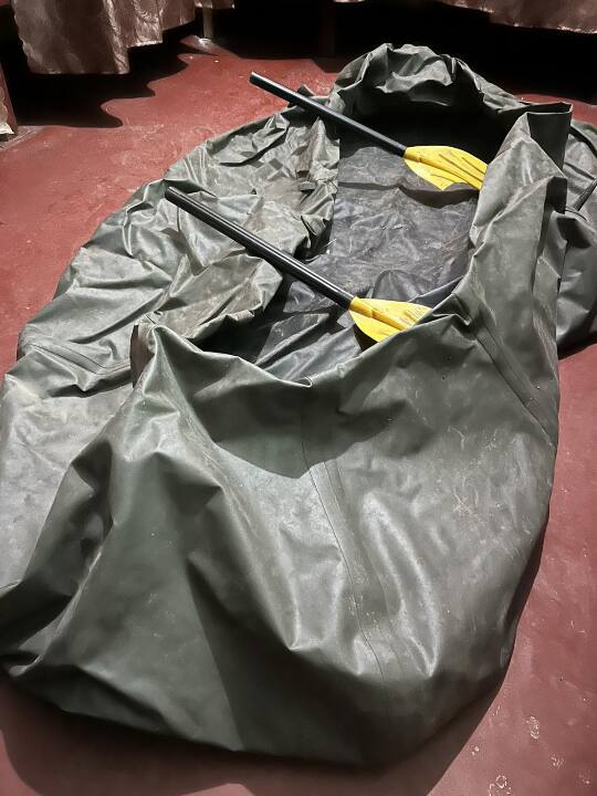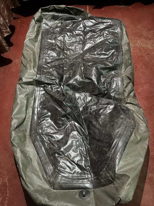 Гумовий надувний човен темно-зеленого кольору з двома веслами, стан б/в, без маркування. Містить сліди пошкодження (потертості), сидіння відсутні. Робочий стан на наявність проколів не перевірявся у зв'язку зі спущеним станом човна.