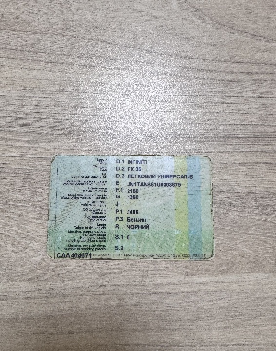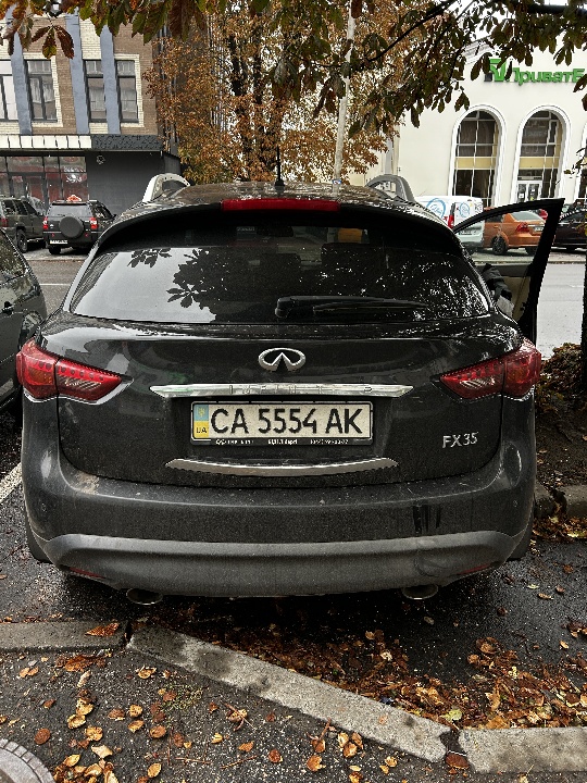 Легковий автомобіль марки: INFINITI, модель: FX35, 2009 р.в., номер кузова (шасі) JN1TANS51U0303679, ДНЗ: СА5554АК, чорного кольору, 2009 року випуску. Об’єм двигуна 3498 куб.см., тип пального: бензин. Задній бампер має подряпини. По всьому периметру кузова наявні потертості та незначні подряпини. Пробіг – 245902 км.