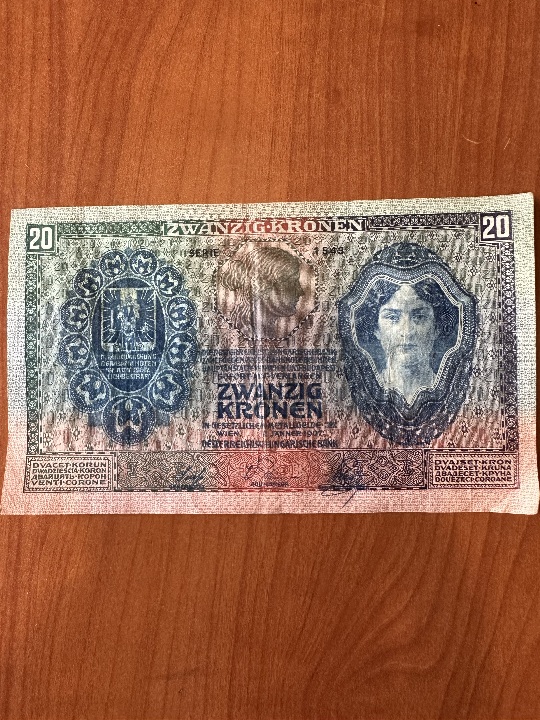 Банкнота номіналом 20 крон, датована 1907 роком, розм.153Х90 мм., виготовлена з паперу, містить текстову і графічну інформацію, з написом HUSZ KORONA 028083 SZAM TORVENYES ERCZPENZT BECS, 1 шт.