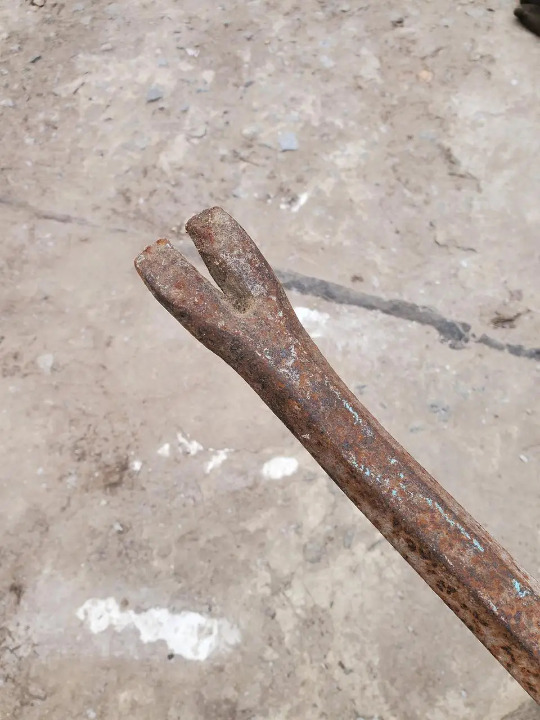 Цвяходер (лом з роздвоєним робочим кінцем), маркування відсутнє або не виявлене, можливі неточності в ідентифікації через значне зношення та корозію металу. Ручний слюсарно-будівельний інструмент. Конструкція: цільнометалевий стрижень циліндричної форми, з одного боку оснащений роздвоєним вигнутим робочим елементом (паз для витягування цвяхів), з іншого — прямий торець. Рукоятка як окремий елемент відсутня, інструмент виконаний з суцільного металу. Стан: вживаний, з явними ознаками тривалої експлуатації. Зовнішні ознаки зносу: значна корозія по всій поверхні, нерівномірний шар іржі, локальні потемніння металу, подряпини та сліди механічного впливу. Краї роздвоєної частини заокруглені внаслідок зношення, проте форма робочого елемента збережена. Інструмент візуально цілісний, тріщин або повного руйнування металу не виявлено. Майно конфісковане на підставі виконавчого листа №177/389/25 виданий Криворізьким районним судом Дніпропетровської області від 18.02.2025 року.