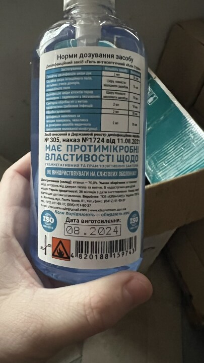 Дезінфекційний засіб у вигляді гелю (автомобільний антисептичний гель), для автомобільного підстаканника та застосовується для антисептичної обробки шкіри та рук. Упаковка: флакон з дозатором. Вага-0,48 кг. Місткість-500 мл. Тип-гель. Призначення: антибактеріальна обробка рук, шкіри, профілактика. Дата виготовлення - серпень 2024, термін придатності 36 місяців.