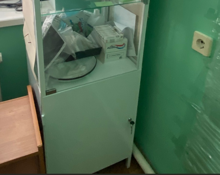 Шафа для медикаментів, білого кольору, б/в. Металева медична шафа з верхньою заскленою частиною, призначена для зберігання медикаментів.