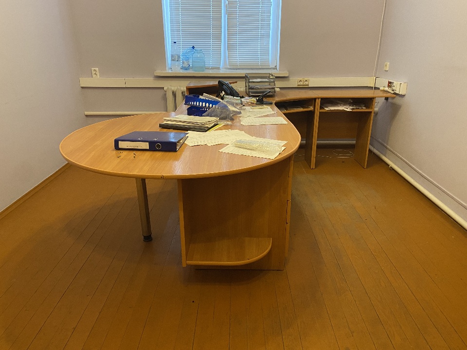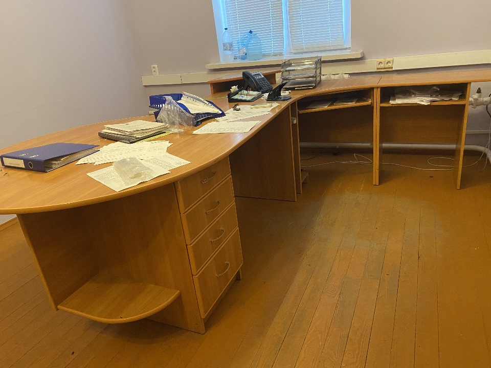 Комплект меблів для офісу: стіл офісний з шухлядами, б/в, - 1 одиниця, шафи з полицями, б/в - 3 одиниці, тумба, б/в - 1 одиниця, шафа дводверна та шафа з полицями зєднані, б/в - 1 одиниця
