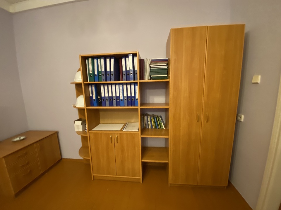 Комплект меблів для офісу: стіл офісний з шухлядами, б/в, - 1 одиниця, шафи з полицями, б/в - 3 одиниці, тумба, б/в - 1 одиниця, шафа дводверна та шафа з полицями зєднані, б/в - 1 одиниця.