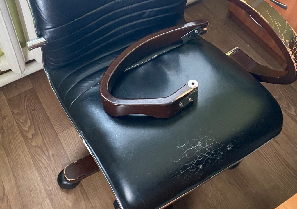Крісло офісне, чорного кольору із зламаним поручнем, б/в. Чорне офісне крісло з пошкодженим дерев'яним підлокітником.