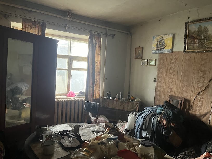 Однокімнатна квартира в оноповерховому будинку, зовнішні стіни цегляні, матеріал перекриття - дерево, водопостачання та каналізація відсутні. Вікна та вхідні двері дерев'яні. Матеріал стін - цегла, побілка; стеля - побілка; підлога дерево. Підстава виникнення права власності: договір купівлі-продажу, ВЕК 729837 Р.№ 981, 12.04.2007р. У житловому приміщенні зареєстрована одна повнолітня особа.