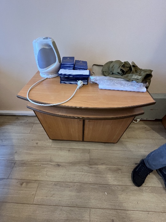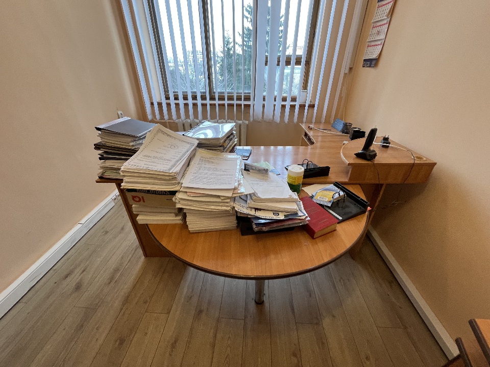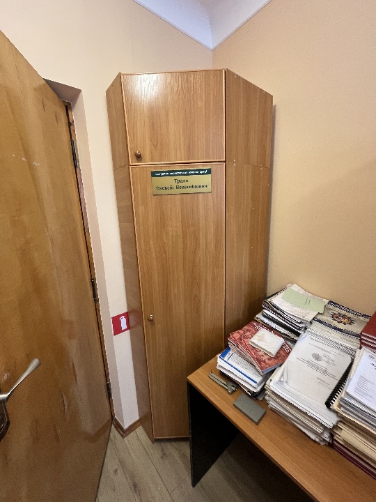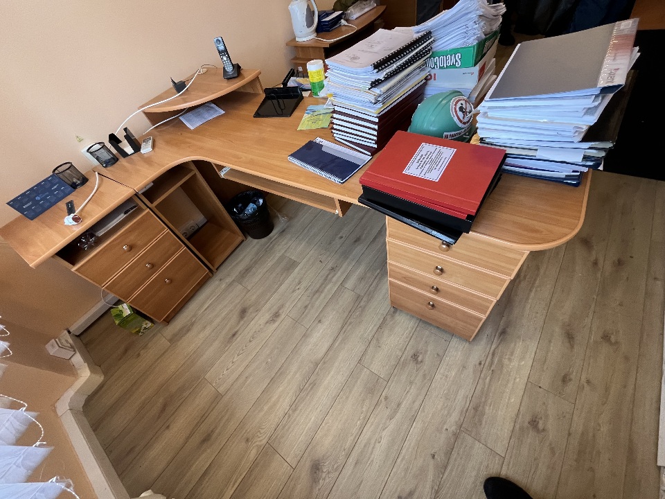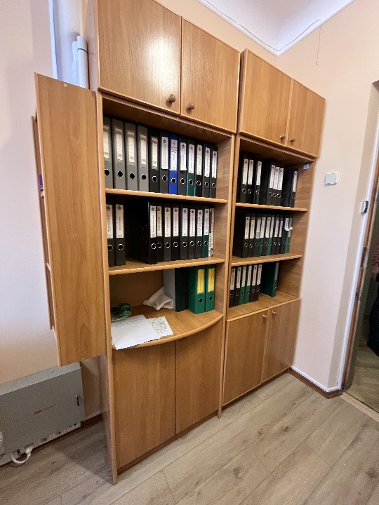 Комплект офісних меблів б/в: стіл, тумба, шафа з полицями, шафа для одягу